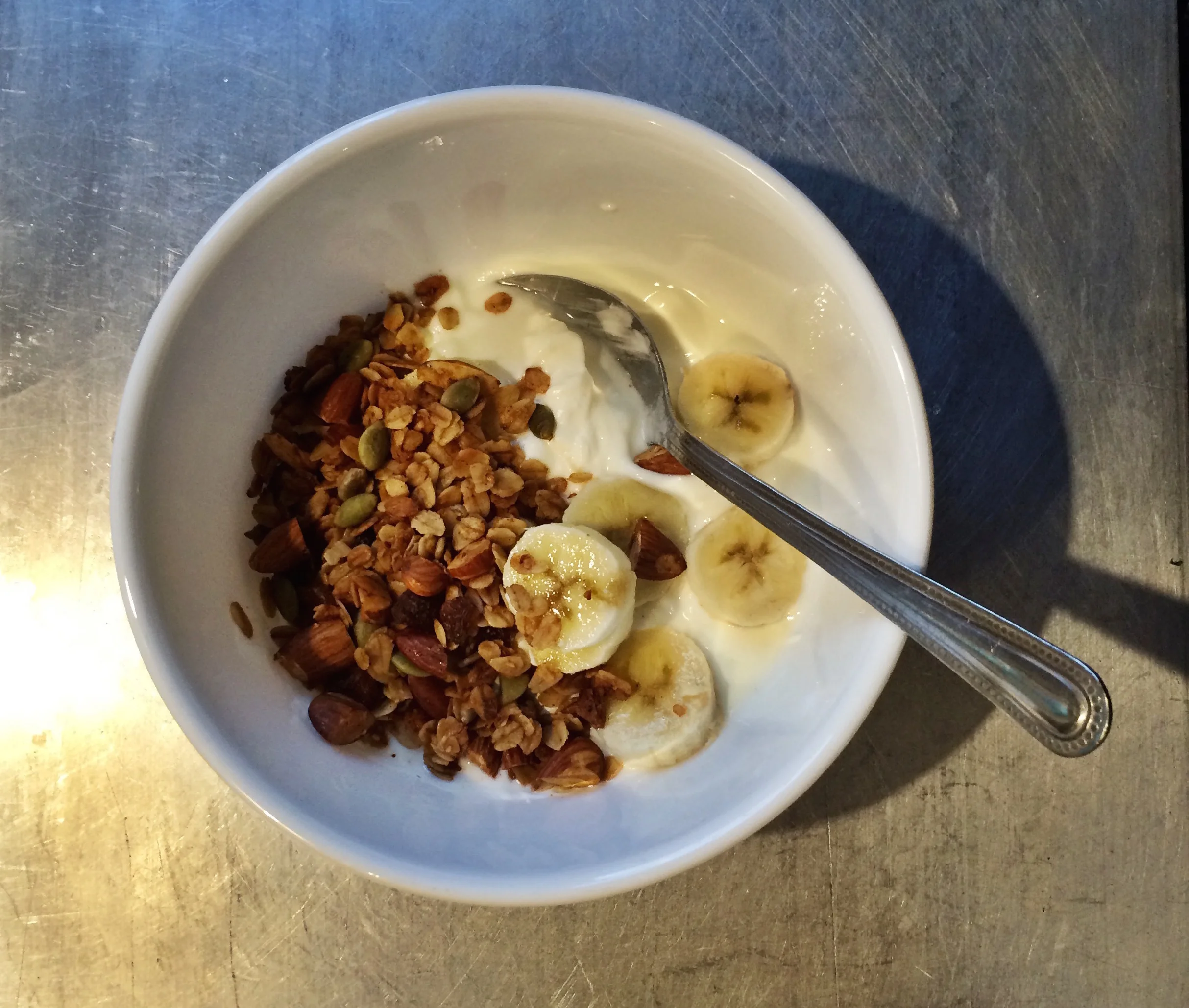 There are so many granola recipes out there. It is very overwhelming. Everyone has their own preferences, from crunchy to chewy, clusters or no clusters, dried fruit or not, level of sweetness… there are endless variations. It is difficult to predict how a particular recipe will turn out and whether it will fit your ideal concept of what granola should be. I was inspired by a great method I found on buzzfeed that solves this dilemma by providing a list of general proportions for ingredients, and you can riff off the recipe from there, developing a sense for whether you prefer more or less sugar, and understanding how the crunchiness varies based on the amount and type of oil. You can develop an understanding of how to make the exact granola that you like, and regardless of your experimentation you know it will turn out well because it fits within the basic framework of this simple recipe:
