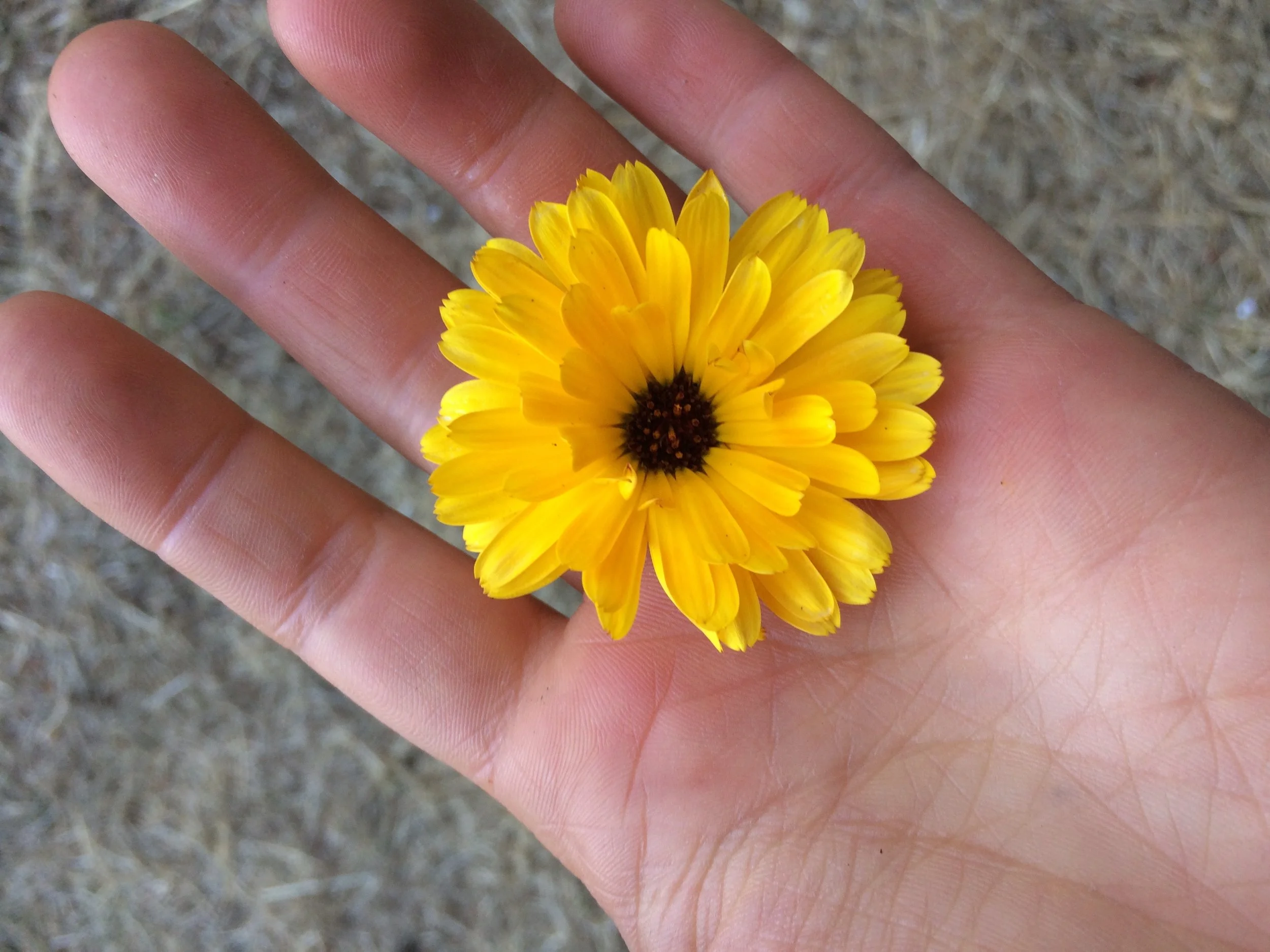 Calendula! Also known as common marigold. This herb is like a little sunflower. It always brings a smile to my face. Calendula is not only a sunny little spark of brightness, it also has important medicinal properties: it is a demulcent (soothing and moisturizing), a vulnerary (helps cuts and wounds heal), anti-inflammatory, and antimicrobial. Altogether these properties make it an ideal herb to apply to the skin for any kind of scrape, irritation, chafe, cut, minor wound, sting, burn, or rash. Calendula salve is one of my staples and part of my initiation in discovering that: herbs! ...they actually do work!