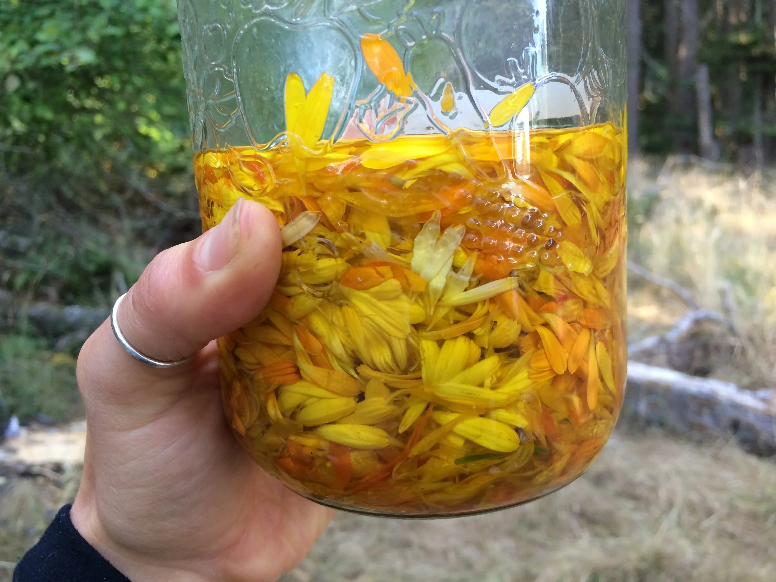 I was inspired to make this salve while on Salt Spring Island because I was finding myself frequently in blackberry bushes or scrambling along the rocks in the intertidal zone, and often covered in scrapes and cuts. Calendula salve is a good all in one - it helps prevent infection and also will hasten healing time. Calendula grows in many a vegetable garden on the island. Gardeners like it because it helps to repel pests. I connected with a few people who were willing to do a trade with me, and I exchanged some edible seaweed I had previously harvested and dried in order gather from their gardens. One of the women who gave me some flowers had a horse farm, and grows a huge amount of calendula to make salves for her horses.